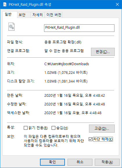 우클릭 > 속성에 들어가서 우측 하단에 차단 해제를 체크해주시고 적용해주세요